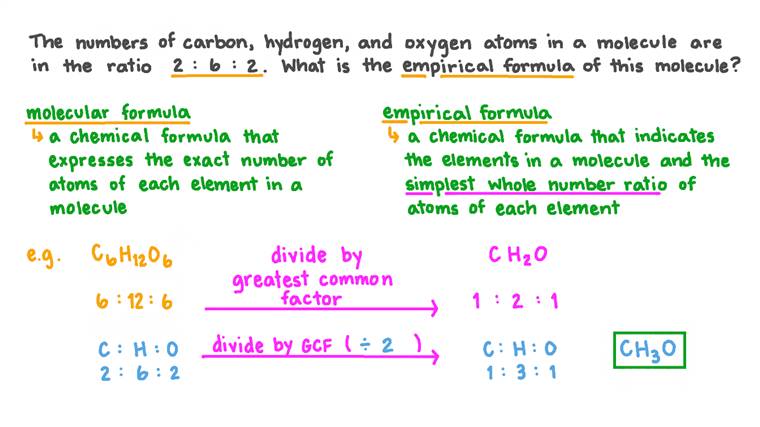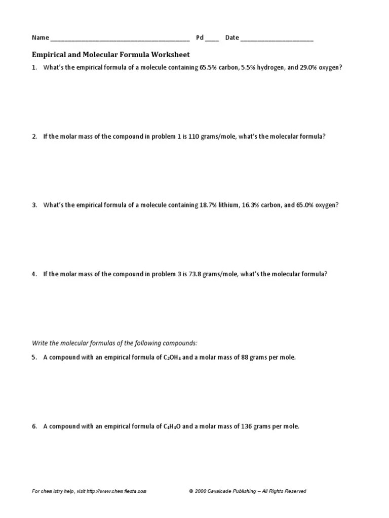 Find the empirical formula of a compound containing 32.0 g of bromine and 4.9 g of . Empirical and molecular formula worksheet. What's the empirical formula of a molecule containing 65.5% carbon, 5.5% hydrogen, and 29.0% oxygen? Empirical and molecular formulas worksheet. In this worksheet, we will practice defining, determining, and converting between a compound's empirical and molecular formulas.